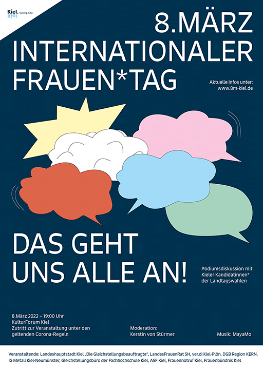 Veranstaltende: Referat für Gleichstellung der Landeshauptstadt Kiel, LandesFrauenRat SH, Gleichstellungsstelle der Fachhochschule Kiel, Frauenbündnis Kiel, Frauennotruf Kiel e. V., SPD Frauen Kiel, Ver.di Kiel-Plön, DGB Kiel Region, IG Metall Kiel-Neumünster